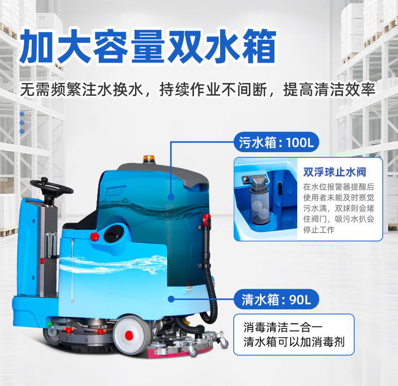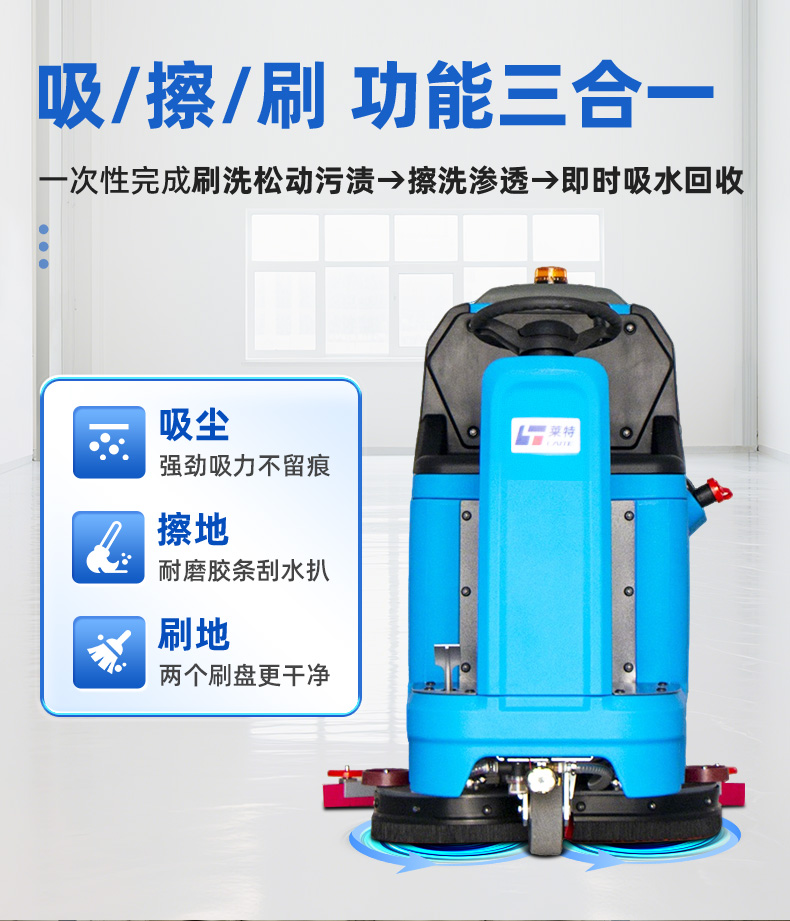 莱特工业洗地机T600型,机身尺寸:1370*800*1300mm,吸水扒宽度:1000mm,额定电压:DC24V,工作效率:3600m²/h,标配电池容量:100A,连续工作时间:3-4h,工作宽度:530mm,刷盘转速:150rpm,刷盘功率:550W,吸水功率:600W,行走功率:1000W,行走速度:0-7km/h,清水箱容量:90L,污水箱容量:100L,声级:60dB(A),整车重量:201kg。具备:全自动升高和降低刷盘、吸水扒;倒车自带吸水趴和刷盘升降功能;污水箱满了自动停机功能;配有水量显示器,可直观观察水位变化;电磁刹车装置,坡道上停车时不会溜车,更安全;采用双控制器系统控制整车电控,维修简单快捷;浮球滤网+传感器双重保护设计可防止污水进入真空电机;更轻便小巧,适用于较小的场所,可直接进出电梯,方便清洗不同楼层;两个注水口设计:大注水口可实现快速注水,小注水口适用于远距离注水;污水箱易清洗。静音设计,适用于对声音敏感的环境,如办公场所,医院;吸水扒易装卸,遇到障碍物时自动脱落,可保护吸水扒,帮助机器顺利通过。